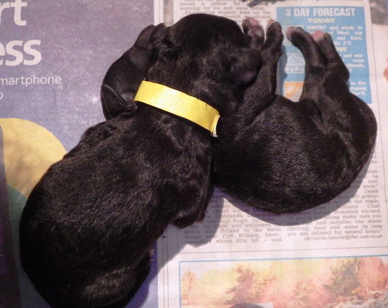 The two smaller puppies have been the first to both open eyes and get up onto all fours – still only for a few seconds but it’s quite a change. The majority are still getting used to the legs and lolloping about just now rolling over one and other, but some pups are on all fours for more than a few seconds. Good progress so far.