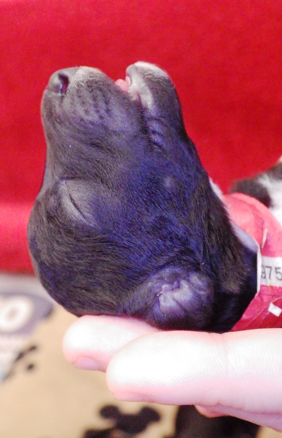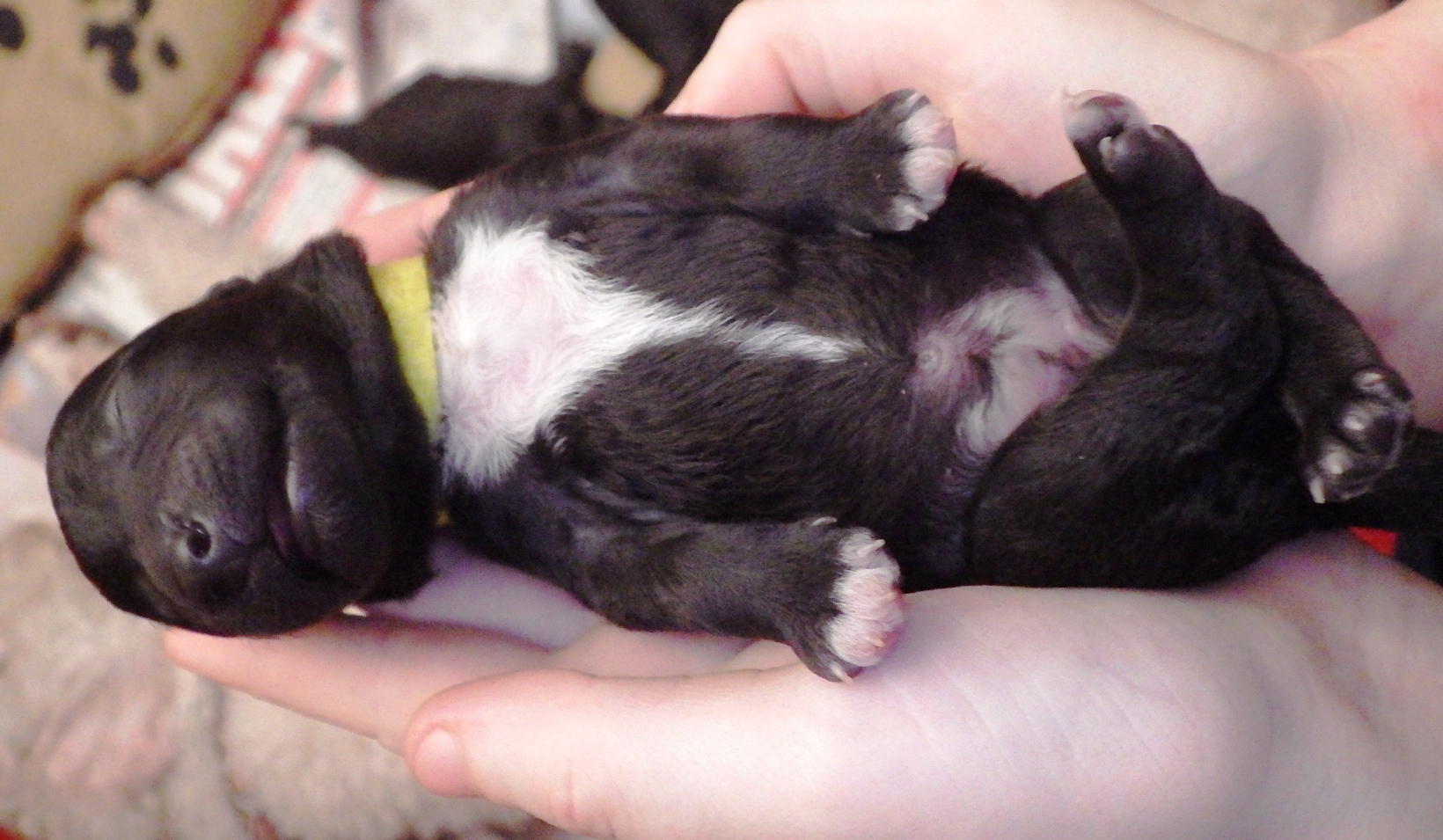 Puppy 3 – Green – born 22:20 – Male – 133g – ‘batman splodge’ marking on her chest, black paws.